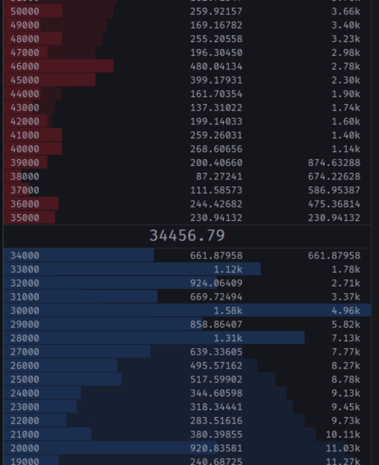 There is 5,000 Bitcoin sat ready to purchase down to a $30,000 price, and another 7,000 BTC down to a $28,000 price on Binance.