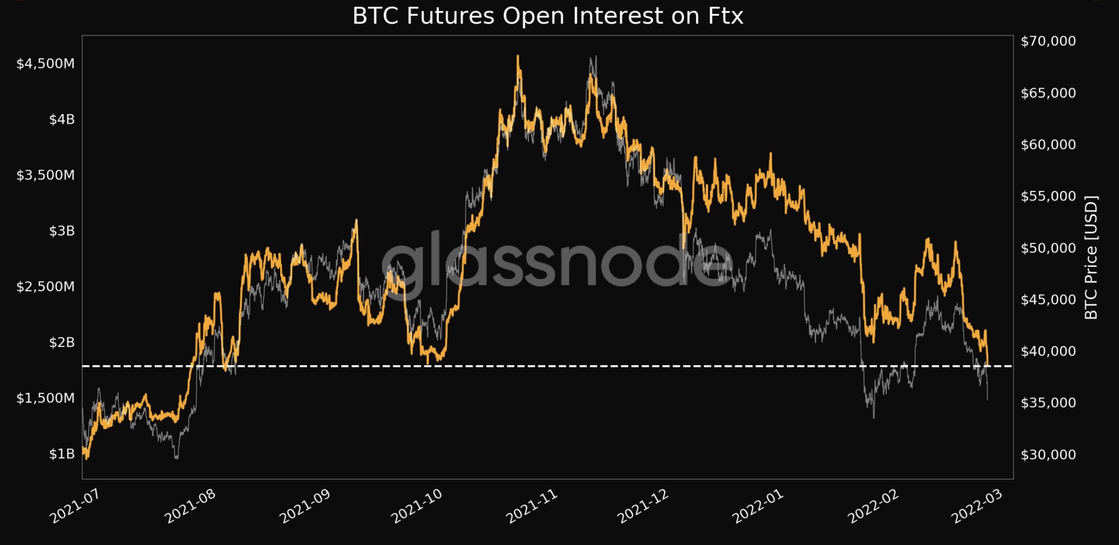 Glassnode reported that “futures open interest just reached a 6-month low of $1,780,397,103.63” on the Sam Bankman-Fried’s crypto exchange, FTX.