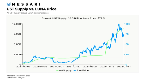 Last year, LUNA witnessed incredible price growth due to a boom in UST adoption. Data compiled by Messari showed that the Terra token rose 14,000% in terms of market capitalization while, at the same time, the supply of UST tokens surpassed $10 billion.