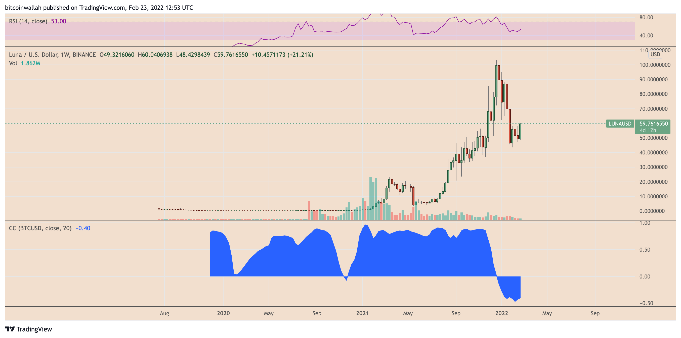 LUNA's price rallied nearly 18% this week to over $58, more than Bitcoin (BTC), whose returns in the same period came out to be a little over 1.5%. Similarly, the Terra token did better than its rival Ether (ETH), which is up around 4% this week.