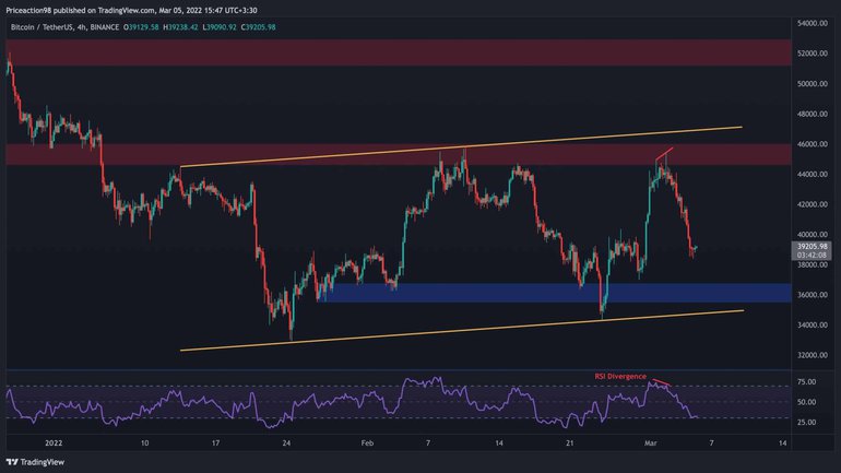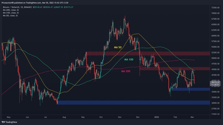 On the other hand, if BTC fails to recover in the next couple of days, the next support level would be the $36K area that the bulls defended the last time it was tested last Thursday, on the day of the Rissian’s invasion.