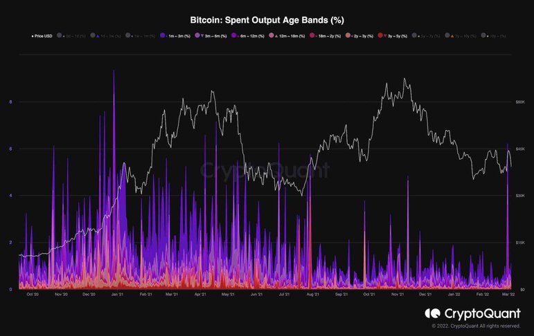 The chart below shows Bitcoin’s Spent Output Age Bands since October 2020.