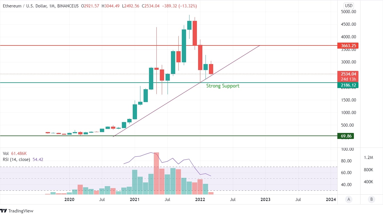 ETH has been on a constant rise since 2020, and the levels we are witnessing right now are close to its strong support level of $2100. The falling value should get some support near the $2100 levels in the long term and continue to move upwards. With volumes still to match Mid 2021 highs, there is huge potential in ETH. The previous two candles have a higher downside wick, indicating buying at lower levels although there is overall profit booking.