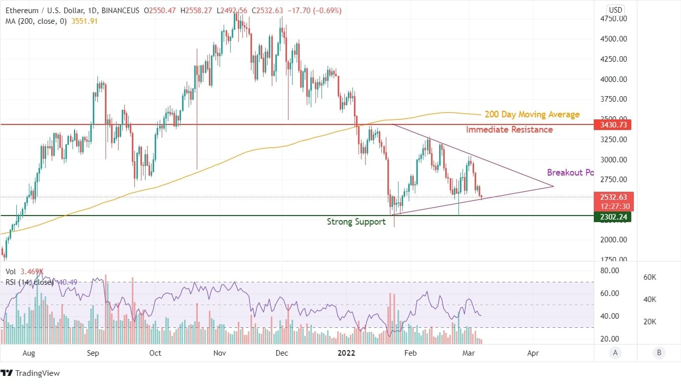 Ethereum, now the reigning second-largest cryptocurrency in terms of market capitalization, is now down by its peak to a huge margin. Its immediate support levels breaking and profit booking taking place at every upside movement indicate downtrend movement in the short time frame. ETH now carries a combined market cap of over $300 billion, but this capital is threatened by the constant downtrend movement of ETH. Even the revered 200 DMA levels now lie close to 40% above the current value of $2536, which comes around $3500. But this curve is constantly moving down to new lows.